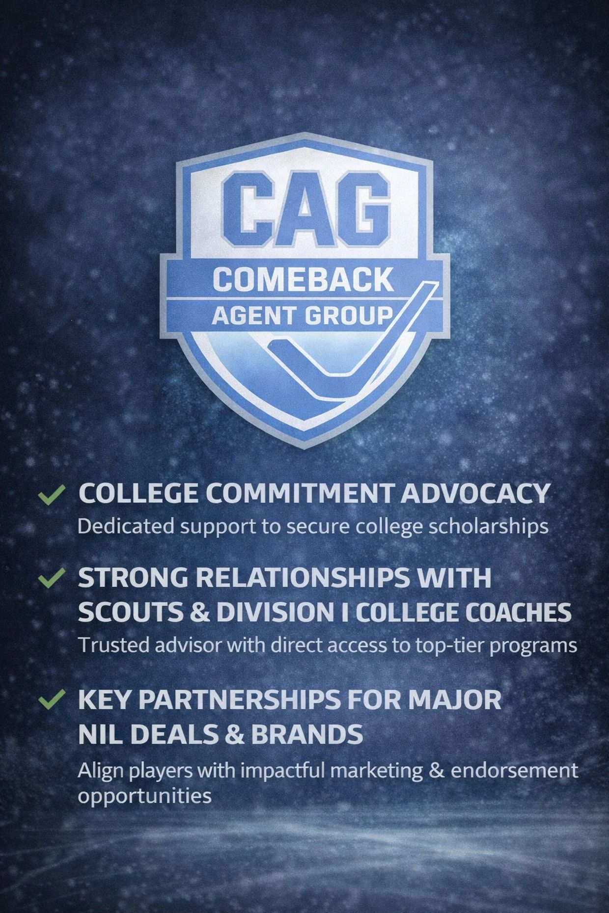 Comeback Agent Group - Hockey, is dedicated to guiding aspiring hockey players toward their dreams of playing at the collegiate and professional levels. As a nationally recognized sports agency we specialize in personalized advising for youth, high school and pro athletes, helping them navigate the complex world of college recruitment, NIL opportunities contract negotiations and professional opportunities. Our team provides expert guidance on player development, exposure strategies, and career planning, ensuring each athlete has the tools and knowledge to reach elite hockey levels. We have extensive relationships with coaches and scouts across the country, as well as NIL sponsorship relationships with major brands. With relationships at that level, choosing an agent becomes easy. At Comeback Agent Group - Hockey, we turn potential into opportunity and help young players make their dreams of getting to the next level, come true — stronger, smarter, and ready for the next level.